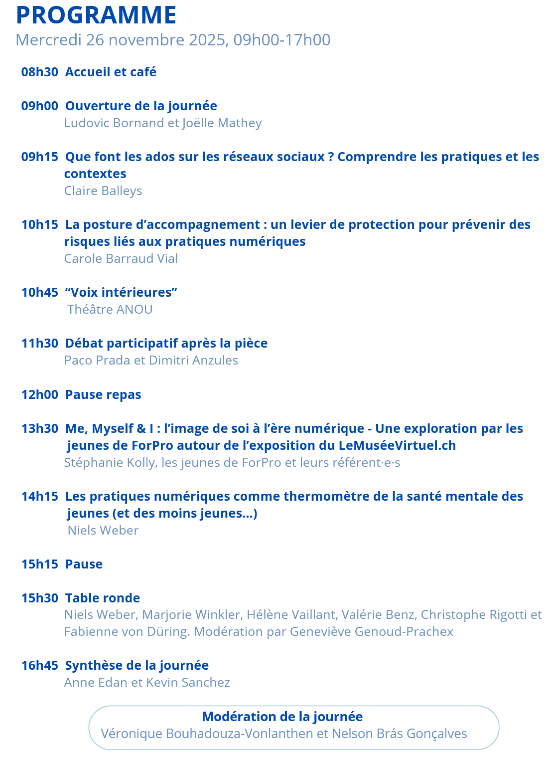 « Tous les Évènements 8ème colloque aire d’ados du réseau santé-social à l’épreuve de la crise suicidaire chez les jeunes, 26.11, Genève novembre 26 @ 9 h 00 min - 17 h 00 min « Café-parents « Les écrans & nos enfants », 24.11, Lausanne Jeunes sur les réseaux sociaux : entre risques et ressources Ajouter au calendrier Google Agenda iCalendar Outlook 365 Outlook Live Détails Date : novembre 26 Heure : 9 h 00 min - 17 h 00 min Évènement Tags:adolesents, colloque, genève, réseaux sociaux Site : https://www.airedados.ch/event-details/colloque-2025 Organisateur AiredAdos Voir le site Organisateur Lieu GrandLab de la Fondation ForPro Rte de la Galaise 23A Plan-les-Ouates, 1228 + Google Map Share this Post